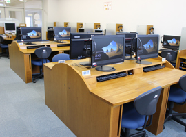 3教室で計146ブースを備えたコンピュータ支援による語学学習教室です。最新のシステムを導入し、効率的・効果的な授業展開はもちろん、英会話やTOEFL、TOEIC、英検の試験問題などを、各自の興味とニーズに合わせて個別に学習することができます。北海道産の木材(ナラ)を使用した特注品の机は、落ち着いた学習環境をつくりだすだけではなく、長期間にわたって使用することが可能な環境にも配慮したものとなっています。