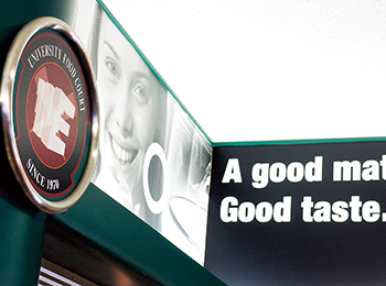 3階は学生食堂となっています。食堂はカフェテリア方式を採用しており、食事もさまざまなメニューの組み合わせができます。また、眺望にも優れ、西側ホールでは、手稲の山並みや札幌ドームなど、札幌の街並みを眺めながら落ち着いて食事ができます。