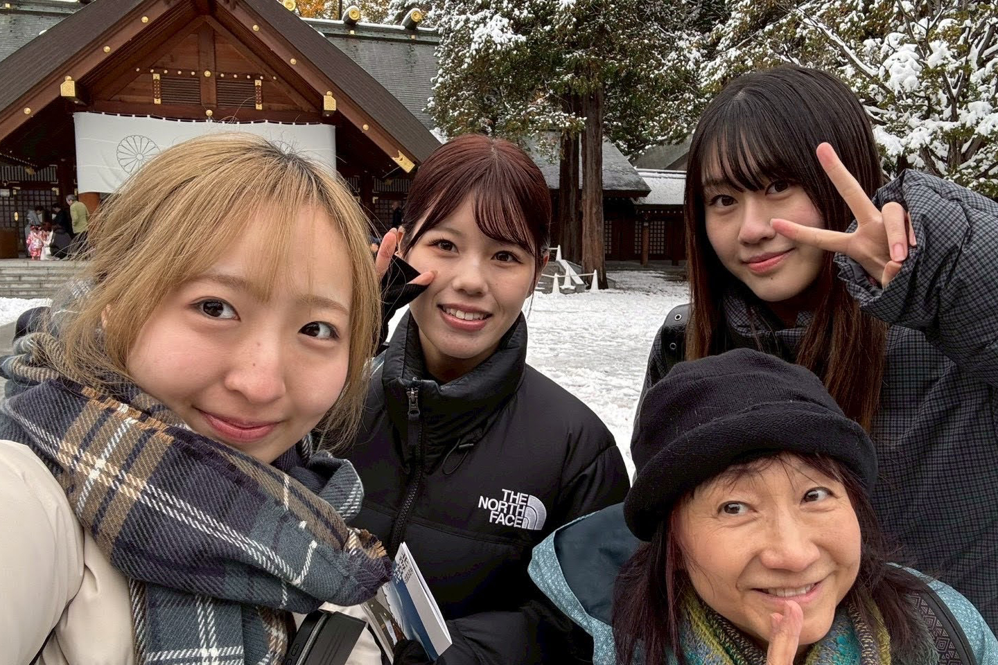 訪問先は北海道神宮です。北海道開拓の歴史、神道の概要、参拝の作法など、多様な内容を「どのように英語でわかりやすく、かつ興味を持ってもらえるよう伝えるか」をテーマに学びました。学生は4つのグループに分かれ、各グループに1名のガイドの方が担当し、現場ならではの具体的なアドバイスをいただきました。今年は境内に雪が積もる中での実施となり、厳かな雰囲気の中、学生たちは教室では得られない臨場感のある学びを体験することができました。