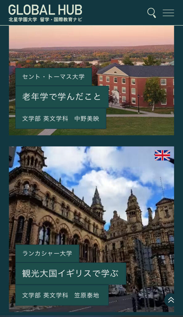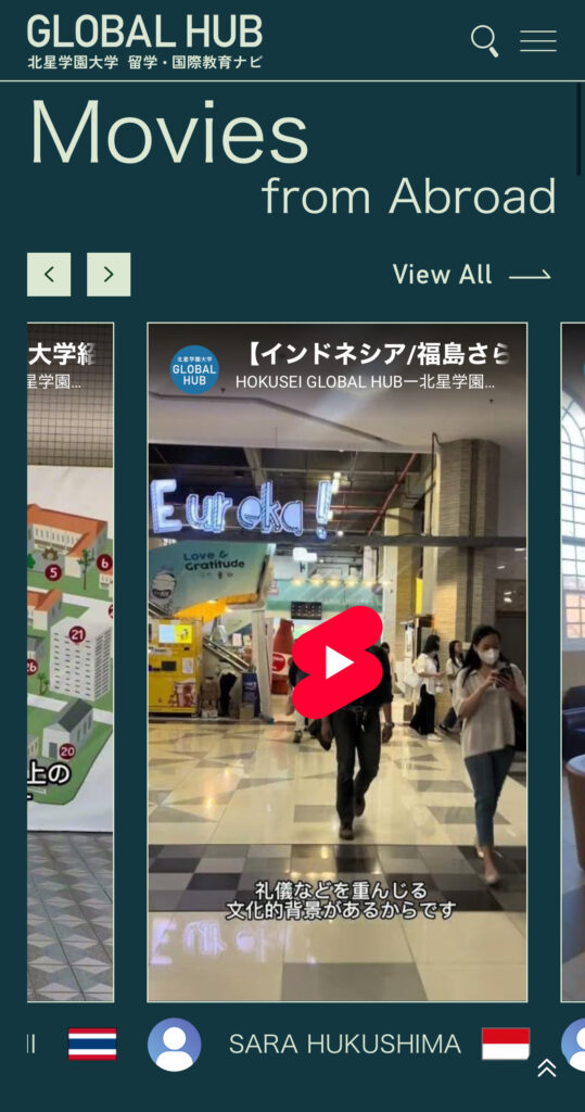 「GLOBAL HUB」では、北星の学生たちが経験してきた「テーマのある留学」のレポートや学生たちのリアルな留学生活をショート動画で公開中!また、留学を経験した先輩たちの卒業後の活躍、多彩な北星の留学プログラムや協定先を紹介しています。