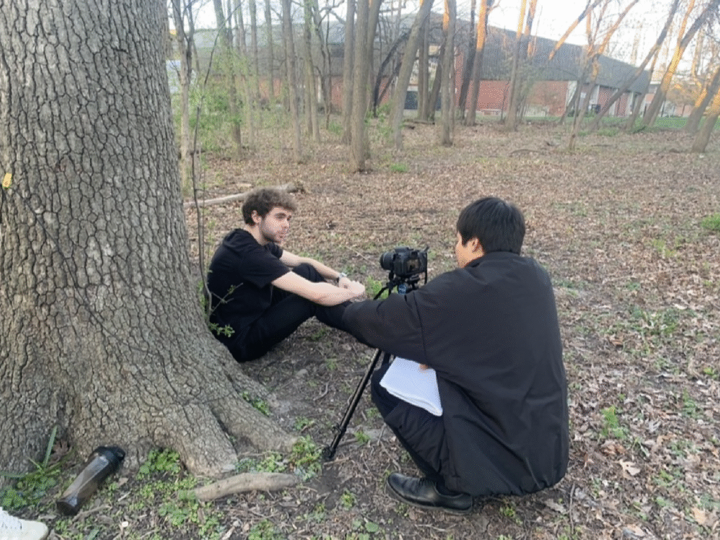 私は充実したFilmmakingのプログラムがあることに魅了され、この大学に留学することを決めました。初回のクラスでは一つのカメラを教室内で回し、カメラを持った学生が他の学生に質問をするという自己紹介をしました。自己紹介さえもクリエイティブなのかとワクワクしたのを覚えています。授業では技術的な側面を学びつつ、先生のおすすめ映画を一緒に視聴し、それについてディスカッションをしました。自分では発見できないようなアメリカ映画の魅力に気づかされました。私はノンフィクションをテーマに制作に取り組みましたが、クラスメイトでフィクションを制作していたチームにも入れてもらい、その撮影にも参加しました(下の写真)。