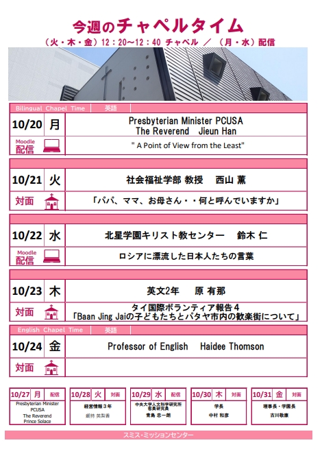月・水曜日はMoodle上での<学内限定>オンデマンド配信(札幌市内や国内にとどまらず、海外の方々のお話を聞く事ができます。月曜日はバイリンガルチャペルとし、英語のみならず様々な言語でのメッセージビデオが届きます)、火・木・金曜日の12:20-12:40 は学内の教職員、学生、学外からの講話者を迎え、大学チャペルでの対面形式による礼拝を行っています(金曜日は本学英語教師陣の英語での礼拝の後、先生方とのディスカッションタイムがあります)。