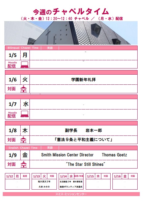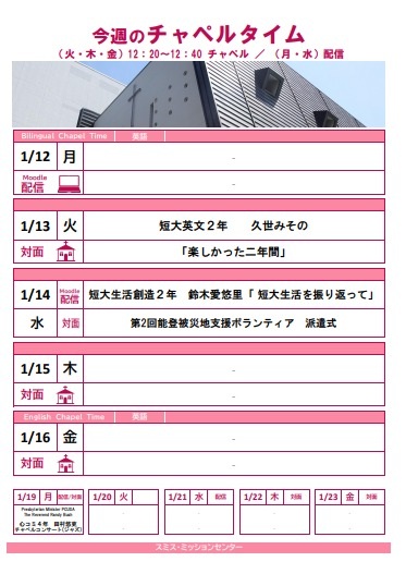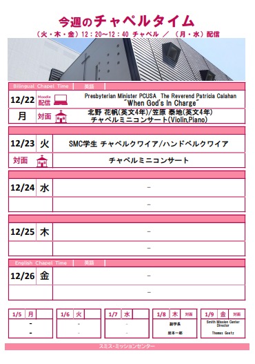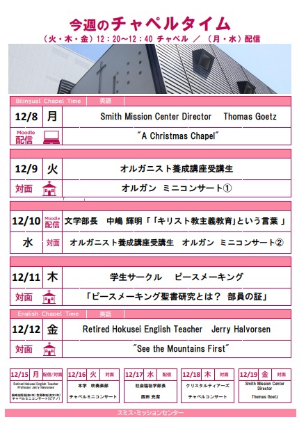 月・水曜日はMoodle上での<学内限定>オンデマンド配信(札幌市内や国内にとどまらず、海外の方々のお話を聞く事ができます。月曜日はバイリンガルチャペルとし、英語のみならず様々な言語でのメッセージビデオが届きます)、火・木・金曜日の12:20-12:40 は学内の教職員、学生、学外からの講話者を迎え、大学チャペルでの対面形式による礼拝を行っています(金曜日は本学英語教師陣の英語での礼拝の後、先生方とのディスカッションタイムがあります)。今週の月曜日は対面での学生によるチャペルミニコンサートを行います。