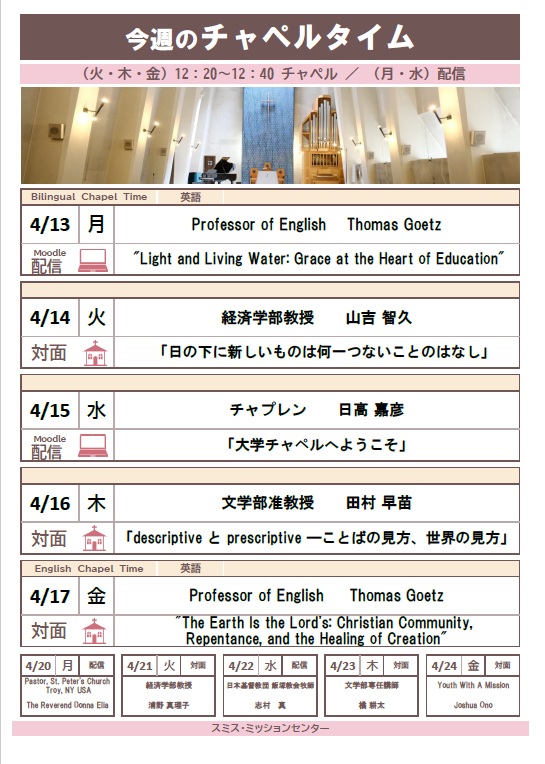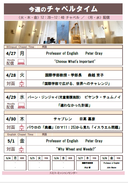 月・水曜日はMoodle上での<学内限定>オンデマンド配信(札幌市内や国内にとどまらず、海外の方々のお話を聞く事ができます。月曜日はバイリンガルチャペルとし、英語のみならず様々な言語でのメッセージビデオが届きます)火・木・金曜日の12:20-12:40 は学内の教職員、学生、学外からの講話者を迎え、大学チャペルでの対面形式による礼拝を行っています(金曜日は本学英語教師陣の英語での礼拝の後、先生方とのディスカッションタイムがあります)。