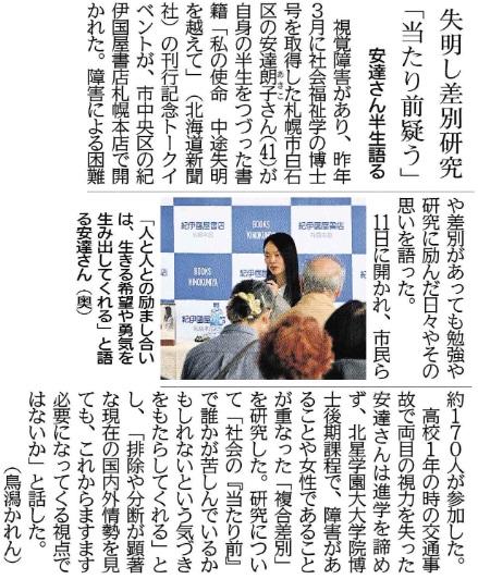 視覚障害があり、昨年3月に社会福祉学の博士号を取得した札幌市白石区の安達朗子(あきこ)さん(41)が自身の半生をつづった書籍「私の使命 中途失明を越えて」(北海道新聞社)の刊行記念トークイベントが、札幌市中央区の紀伊国屋書店札幌本店で開かれました。