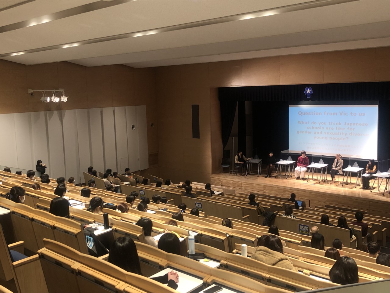 このプロジェクトは私たち英語副専攻学生が企画しました。ローリングス先生の研究分野はジェンダー、LGBTQ+の若者と社会構造です。昨年の3月に授業で先生とオンラインでお会いして以来、何か一緒に活動ができればと思っていたところ、今回の来学が実現しました。私たちが当初から意識していたことは「多様な学生がより安心できる場所を北星の中に創る・広げる」です。できるだけ多くのイベントを行いたいと考え、来日前は先生と週に1回程度Zoomでミーティングをし、札幌市性教育研究会と共同開催の学習交流会※注1やオープンセッションなどの複数のイベントを企画していきました。