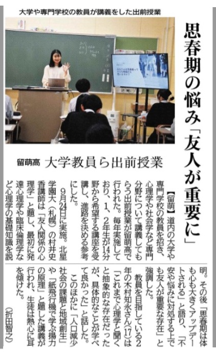 社会福祉学部 心理学科 村井 史香 専任講師の出前授業の様子が、10月1日発行 北海道新聞 朝刊に掲載されました。