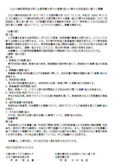 北星学園大学は、公立千歳科学技術大学(北海道千歳市)と連携・協力に関する覚書を締結し、次世代の学びを創出します。