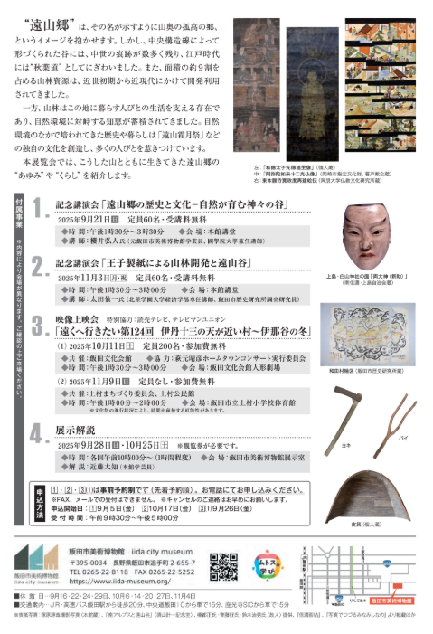 遠山郷の山林資源は社会や人びとの暮らしを支えてきた。本展では、「山」を切り口に遠山郷の歴史と生活、文化を紹介し、今後の地域のあゆみを考える。