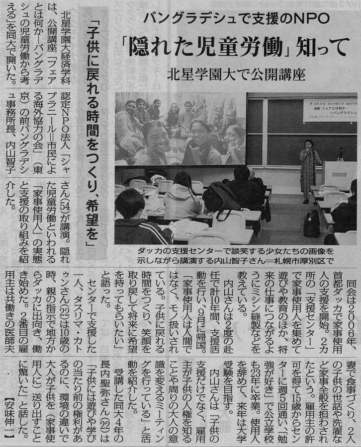 講師には、二度のバングラデシュ駐在を経験し、現地にて10年にわたる支援活動を行ってきた内山智子さん(認定NPO法人 シャプラニール=市民による海外協力の会 バングラデシュ事業担当)をお迎えし、隠れた児童労働といわれる家事使用人の実態と支援の取り組みについてお話いただきました。
