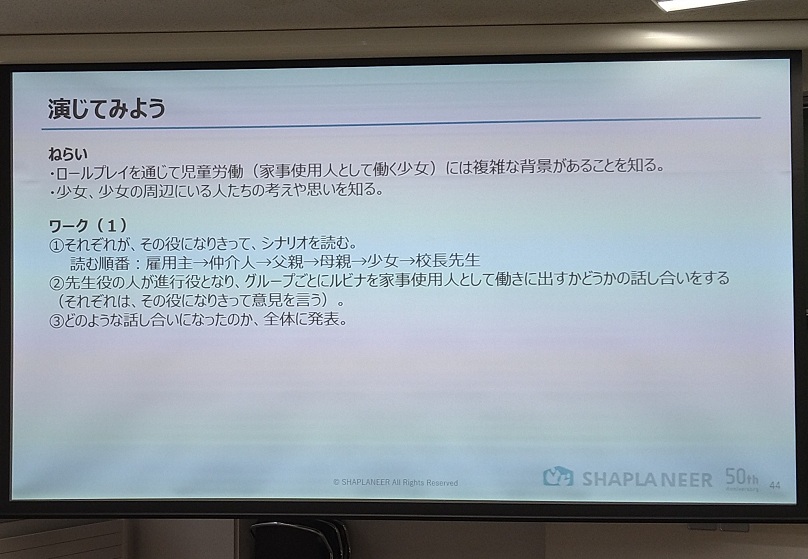 当日会場では参加者が小グループに分かれ、それぞれが雇用主・仲介人・父親・母親・少女・校長先生にの役になりきってロールプレイワークショップを行い、児童労働を取り巻く複雑な背景と当事者の置かれた立場を体験しました。