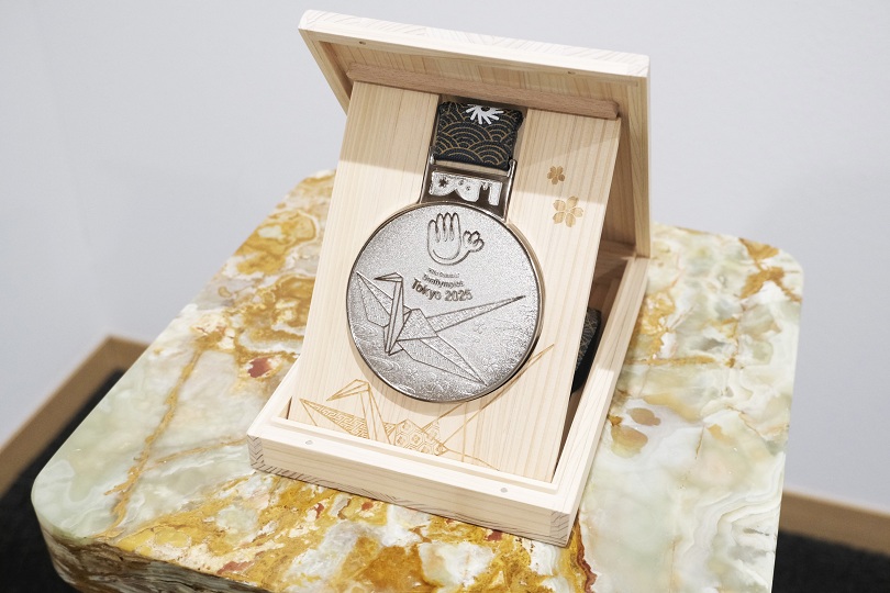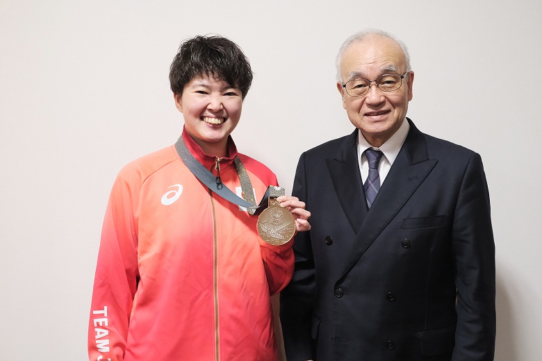 その後、古川 敬康 理事長を表敬訪問し胸にかけたメダルを披露。