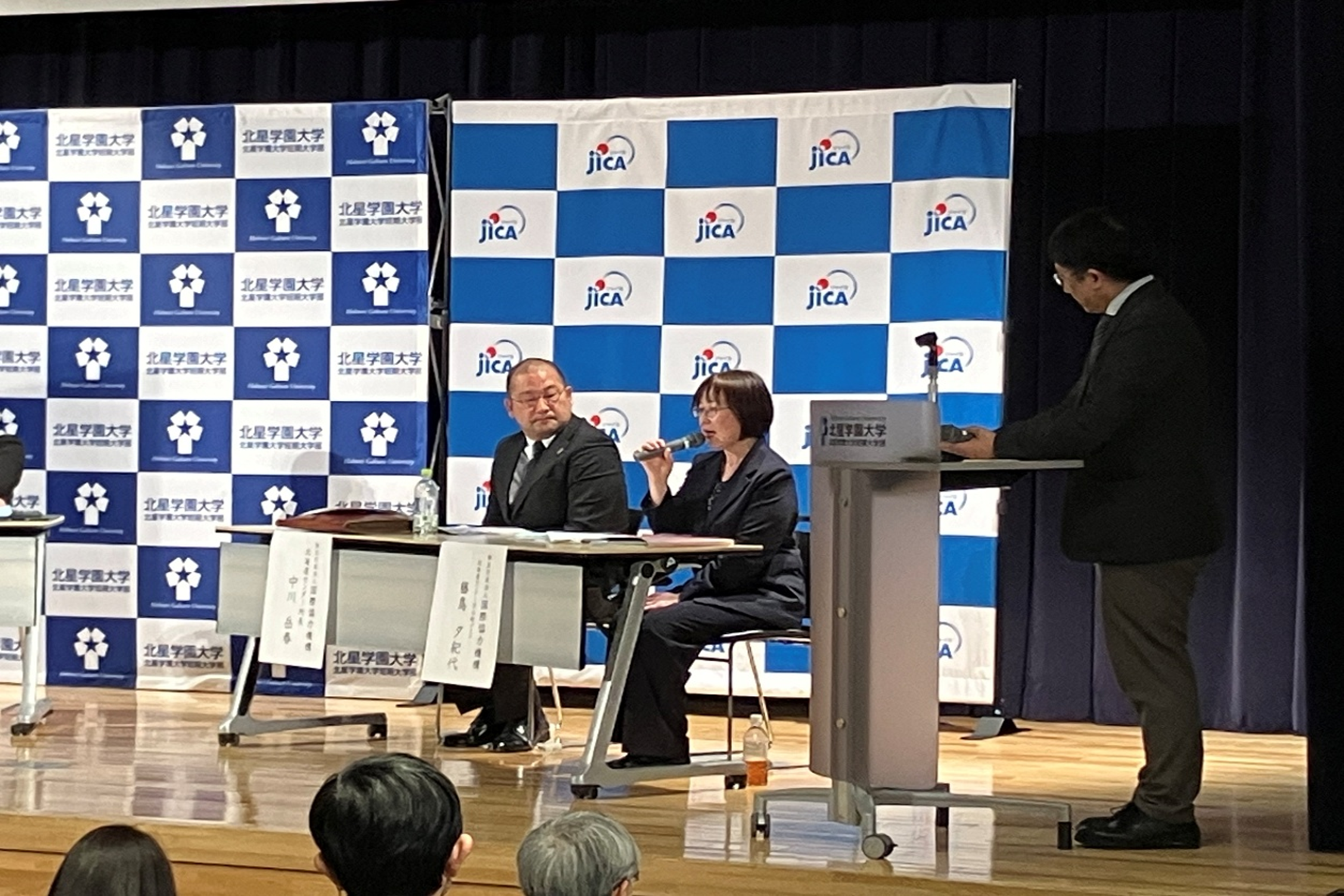 署名式後には、「対話から始める北星学園大学の国際協力」と題するパネルトークが本学の片岡国際教育センター長の司会進行により行われました。パネリストとして、JICA北海道センターの中川所長、本学卒業生でもあるJICA北海道センター苫小牧デスクの藤島さん、本学から中村学長と浦野教授の4名が登壇し、異文化に飛び込んでいく国際協力の現場においては、情熱と対話力が重要であると語られました。また、学生からの質問に対し、中川所長より丁寧にご回答頂く場面もありました。