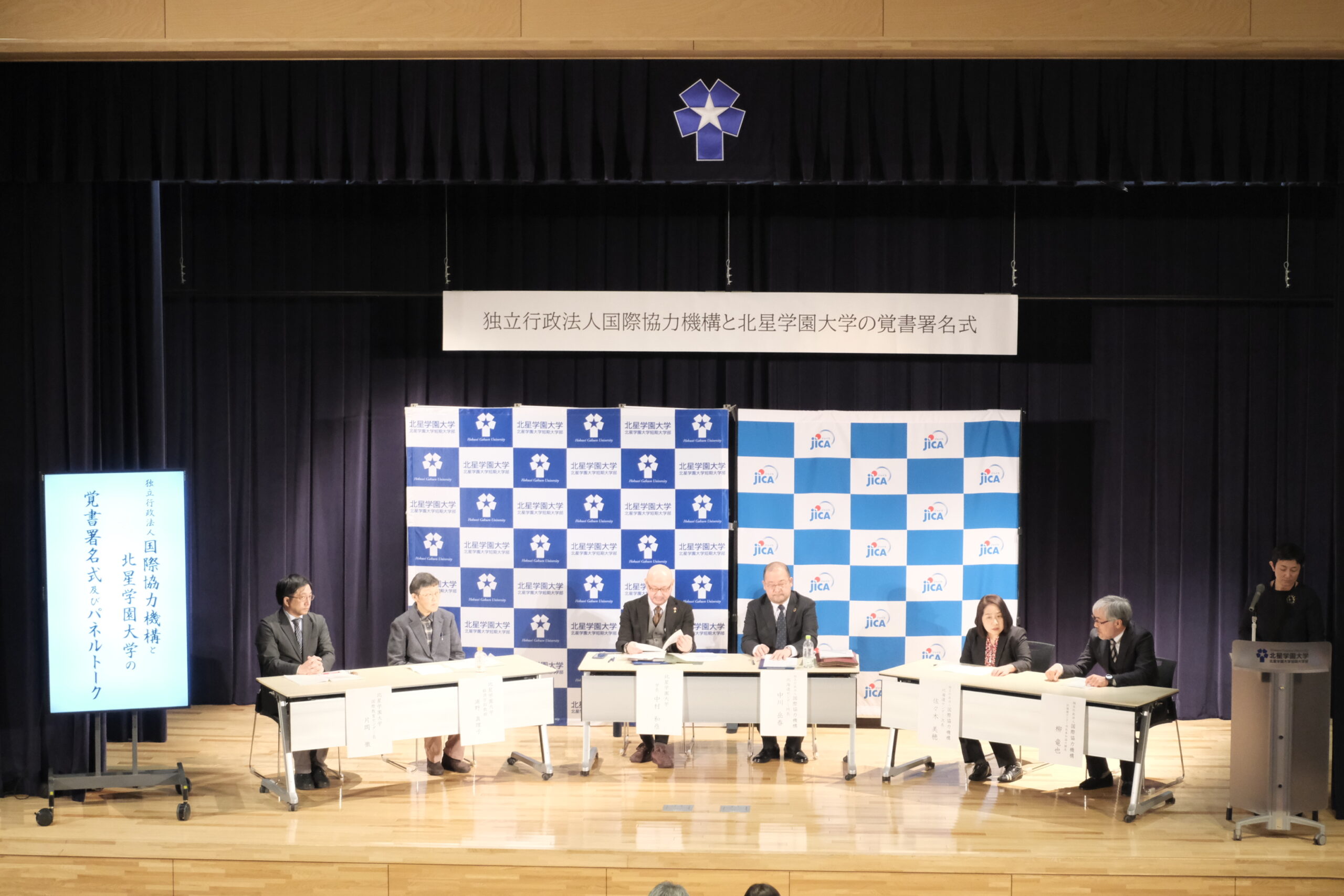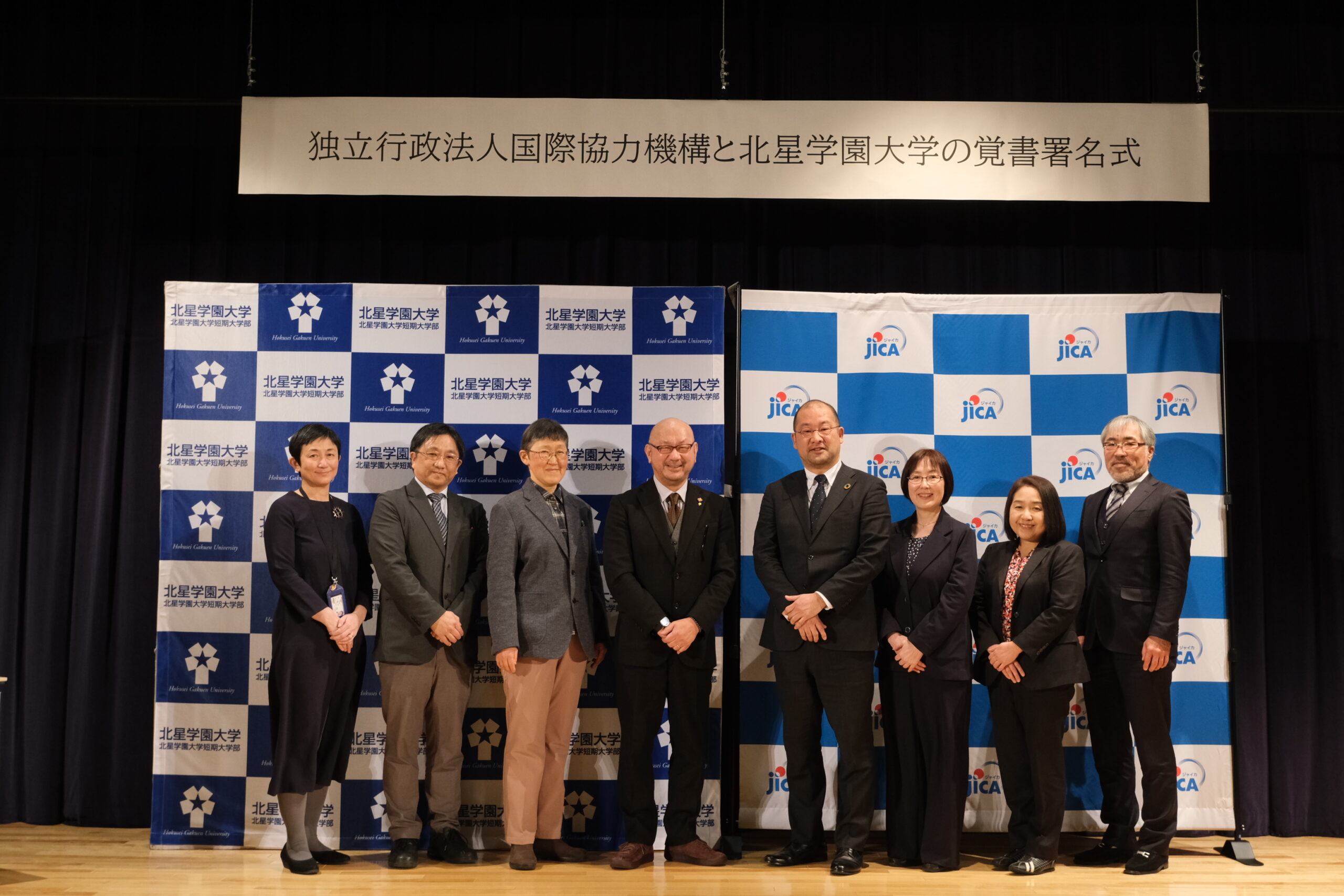 署名式では、JICA北海道センターの中川所長より、今後はJICA職員を講師とした国際協力関連の講座や、JICA北海道でのインターンシップなど、実践的な活動を通じて国際協力の現場を学ぶ機会についてお話し頂けました。本学の中村学長からは、本学の強みの一つである社会福祉分野での知見を活かして、ソーシャルワークの国際的な理解や社会福祉の発展に寄与したいという言葉がありました。