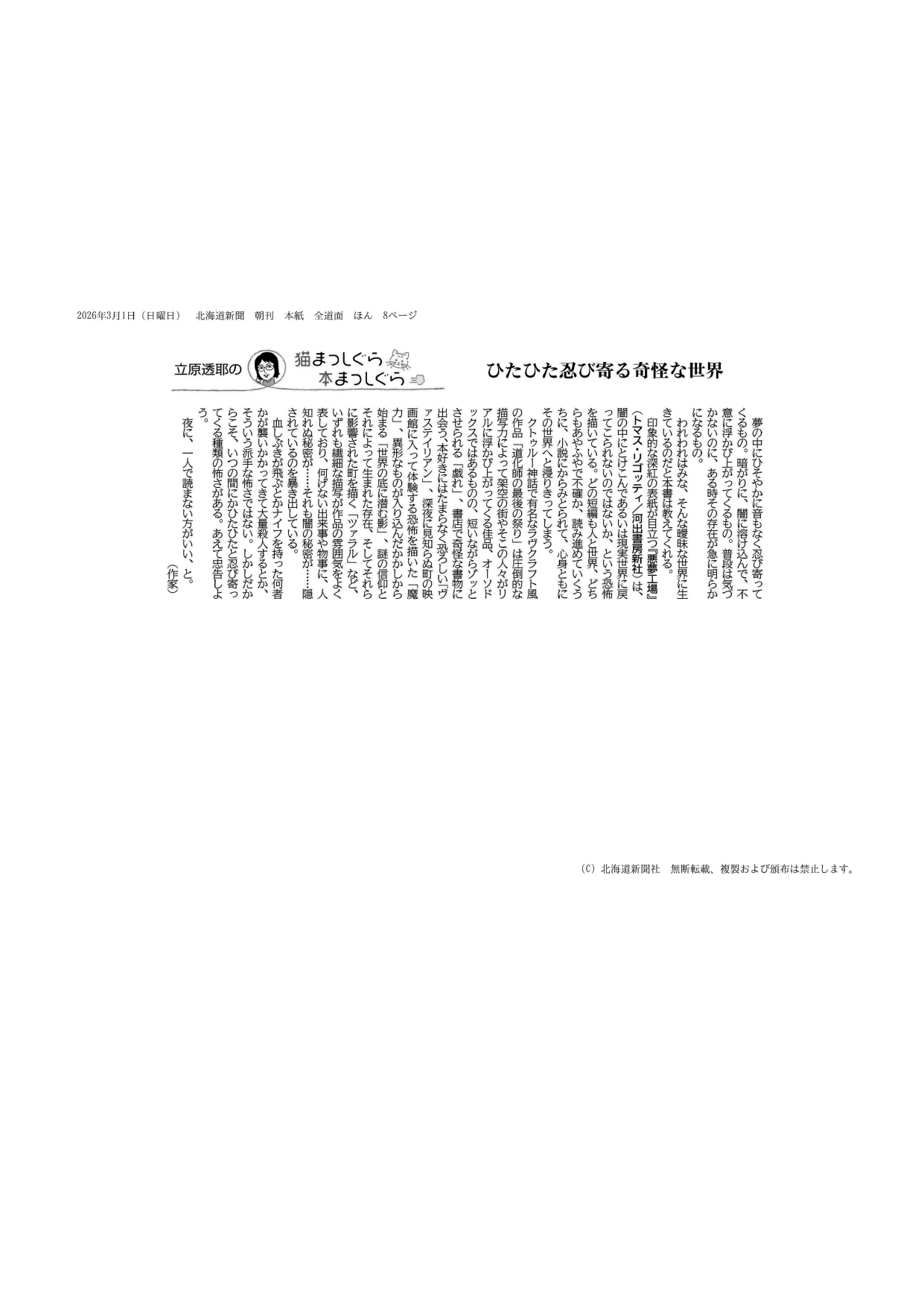 本学文学部山本 範子 教授による書評エッセイ、<立原透耶の猫まっしぐら本まっしぐら>が3/1付北海道新聞にて掲載されました。(※「立原 透耶」は筆名)