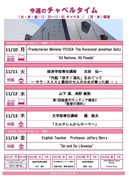 月・水曜日はMoodle上での<学内限定>オンデマンド配信(札幌市内や国内にとどまらず、海外の方々のお話を聞く事ができます。月曜日はバイリンガルチャペルとし、英語のみならず様々な言語でのメッセージビデオが届きます)、火・木・金曜日の12:20-12:40 は学内の教職員、学生、学外からの講話者を迎え、大学チャペルでの対面形式による礼拝を行っています(金曜日は本学英語教師陣の英語での礼拝の後、先生方とのディスカッションタイムがあります)。