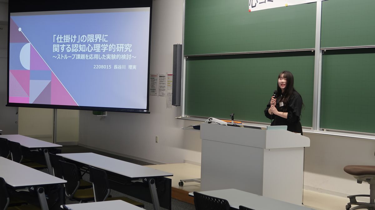 1人目は、長谷川さん(後藤ゼミ)による「「仕掛け」の限界に関する認知心理学的研究~ストループ課題を応用した実験的検討~」というもので、ファイル整理の際に模様などの「仕掛け」による影響から人の情報処理の仕組みについて実験的に検討した研究となっています。
