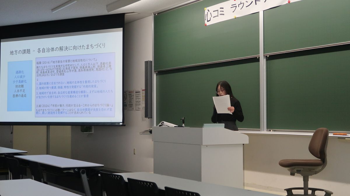 2人目は堤さん(寺林ゼミ)による「地方小都市のまちなか振興に向けたナッジ提案~砂川市を事例に~」という研究で、過疎化、少子高齢化の音大に直面している地方都市として砂川市を事例に、地元の活性化、観光客の誘致といった町おこし、地域振興のために、自然な行動変容を促す"ナッジ"を提案、実践するというものでした。