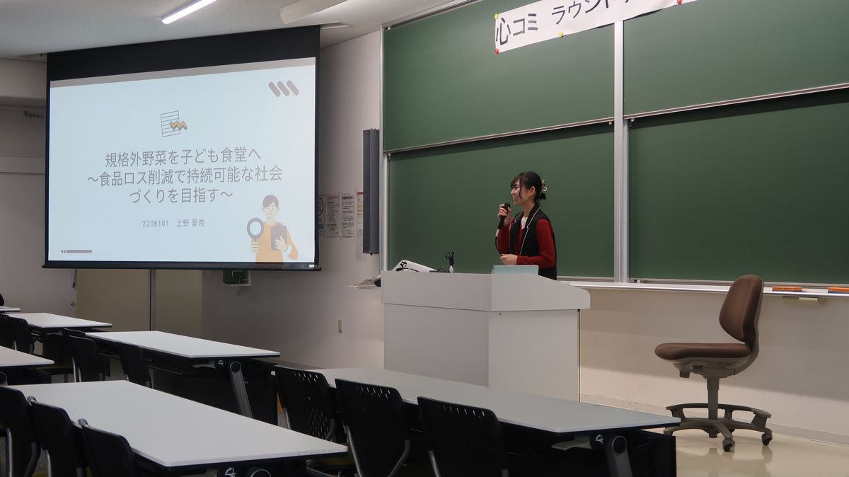 「規格外野菜を子ども食堂へ~食品ロス削減で持続可能な社会づくりを目指す~」というタイトルで、食品ロスの問題の取り組みの一つとして、規格外野菜を子ども食堂に提供する活動を通じて、規格外野菜の流通についての課題などを示すとともに、食育活動などによる規格外野菜、食品ロス問題の理解を促進することを目指した実践的な研究を行いました。