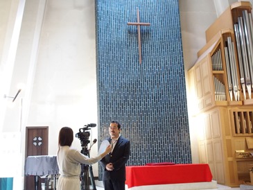 今年で3回目となる「チャペル落語」という取り組みについて、地域のニュースを伝えるテレビ番組で紹介していただけることとなり、チャペル落語終了後、日髙チャプレンが取材を受けました。