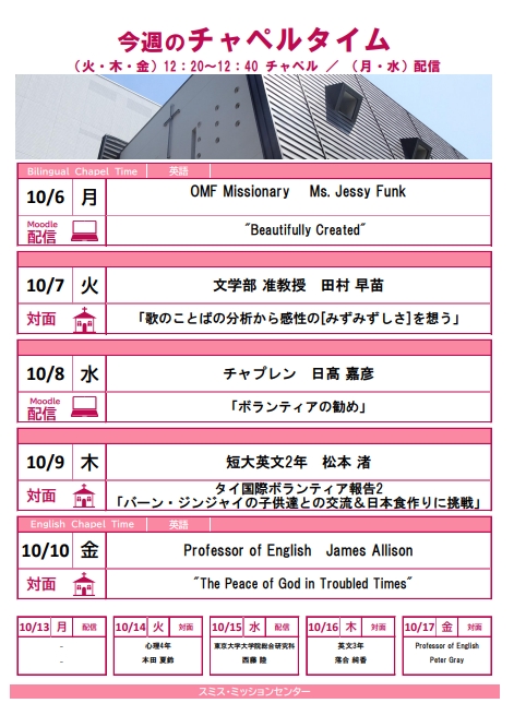 月・水曜日はMoodle上での<学内限定>オンデマンド配信(札幌市内や国内にとどまらず、海外の方々のお話を聞く事ができます。月曜日はバイリンガルチャペルとし、英語のみならず様々な言語でのメッセージビデオが届きます)、火・木・金曜日の12:20-12:40 は学内の教職員、学生、学外からの講話者を迎え、大学チャペルでの対面形式による礼拝を行っています(金曜日は本学英語教師陣の英語での礼拝の後、先生方とのディスカッションタイムがあります)。